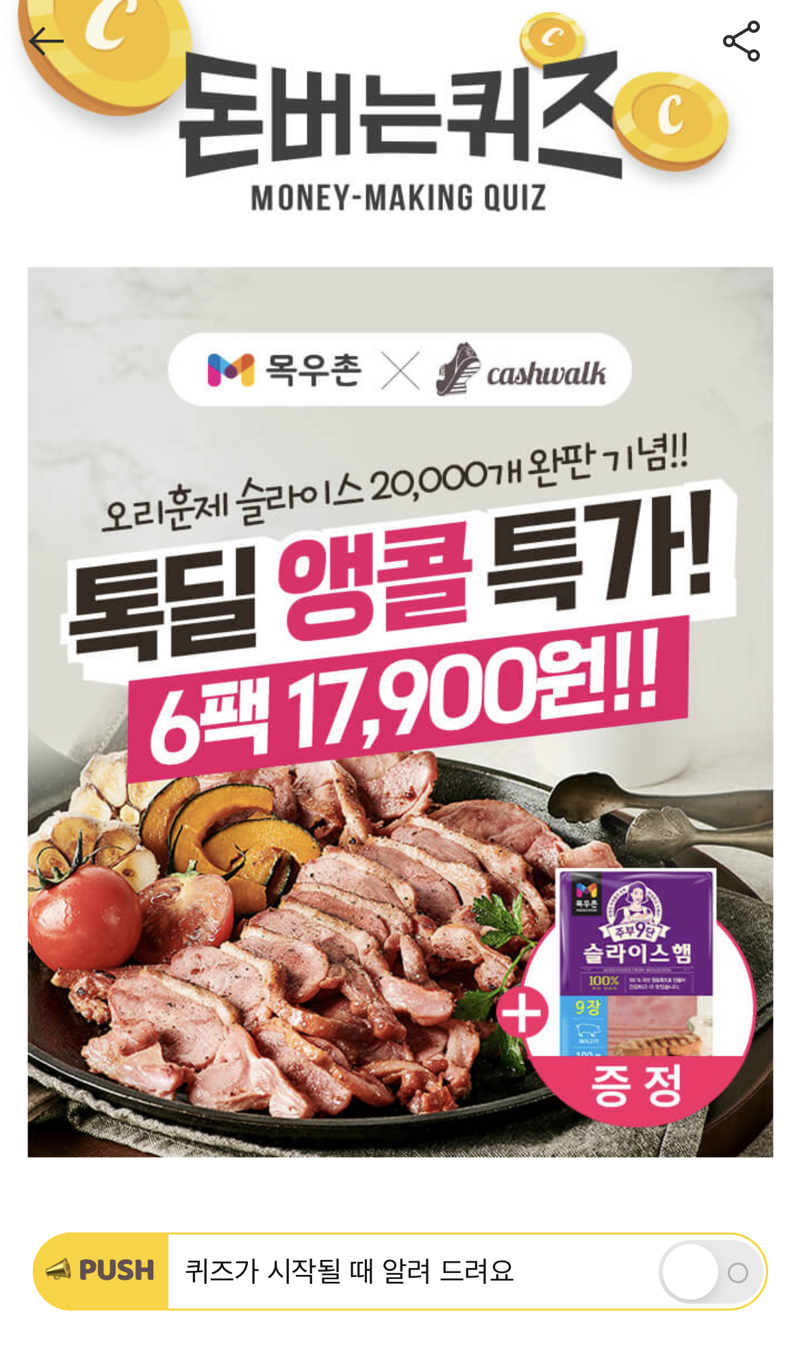 캐시워크 돈버는 퀴즈 정답 목우촌 오리훈제슬라스 ㅊㄴㅁ
