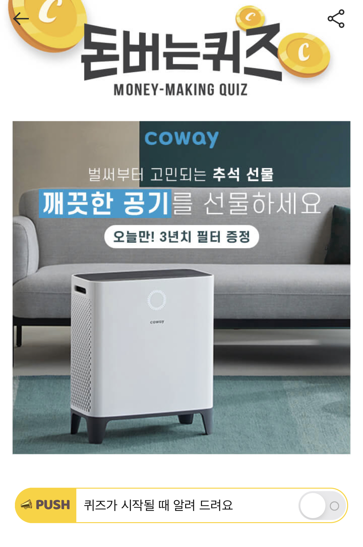 캐시워크 돈버는 퀴즈 정답 코웨이 공기청정기 ㄷㅇㅋㄹ