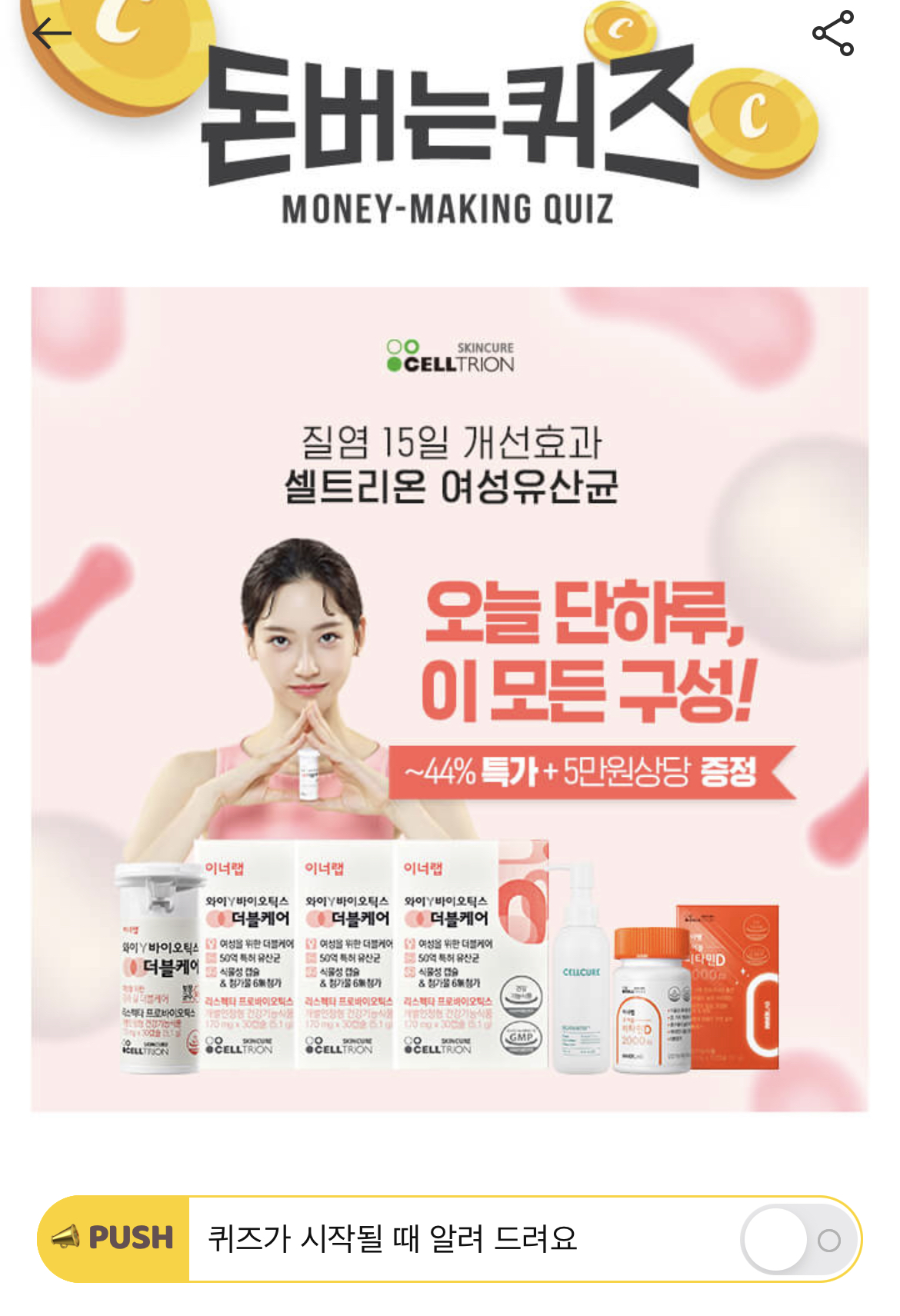 캐시워크 돈버는퀴즈 정답 셀트리온 여성유산균 와이바이오틱스 ㅂㅂ