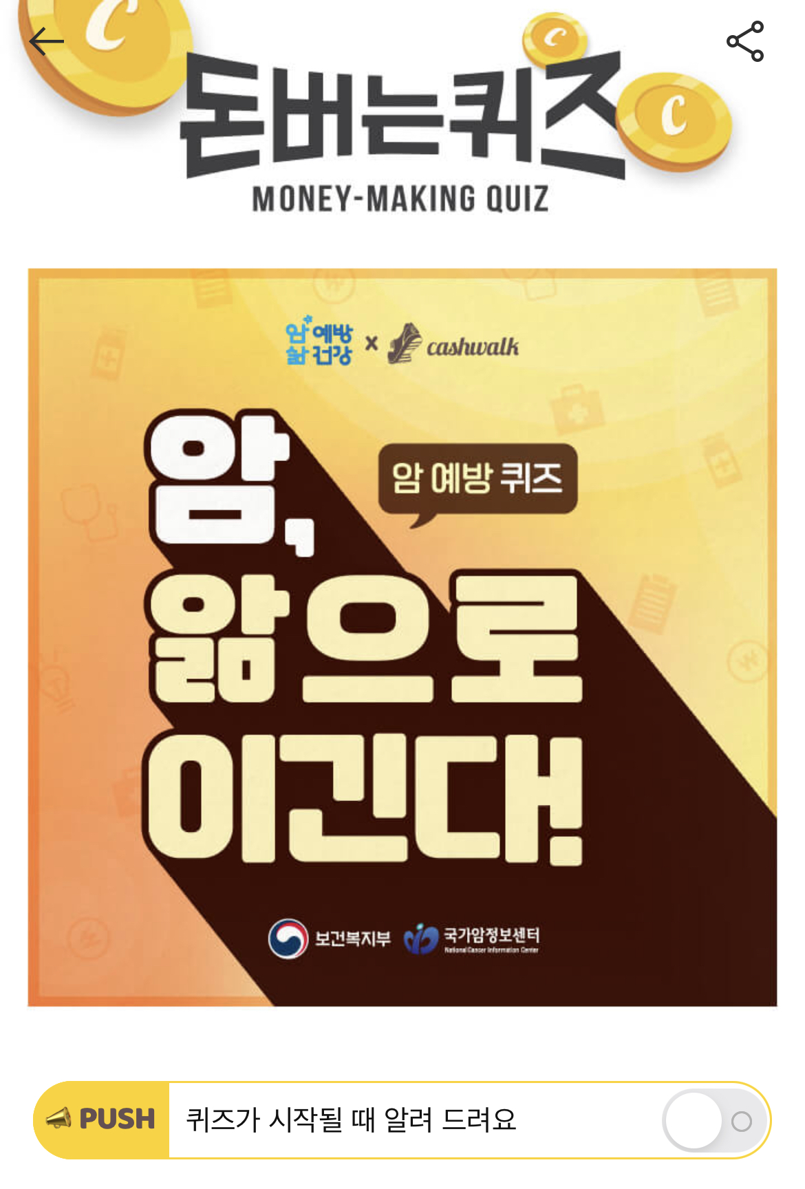 캐시워크 돈버는 퀴즈 정답 암 예방 퀴즈 숫자