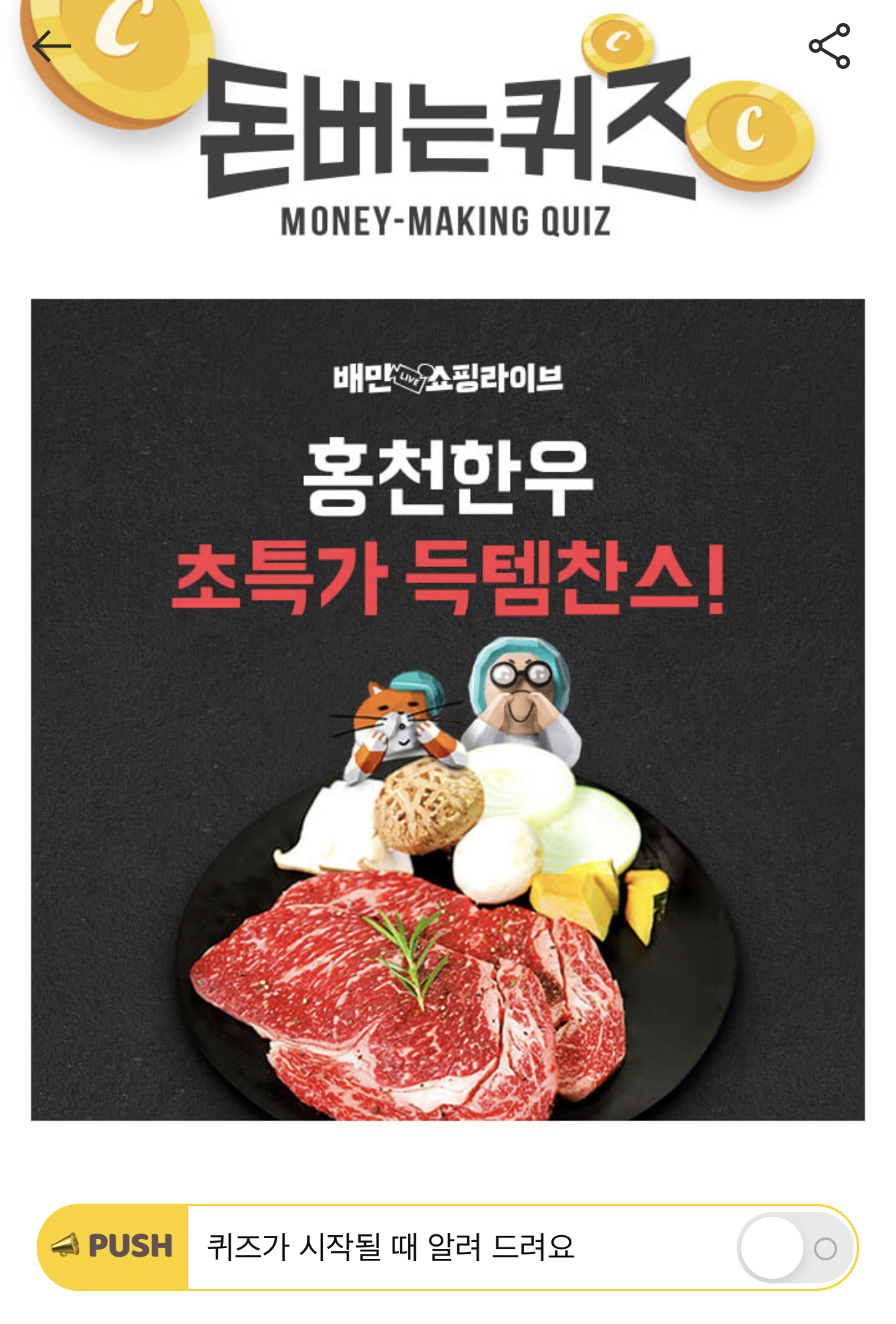 캐시워크 돈버는 퀴즈 정답 배민쇼핑라이브 홍천한우마을