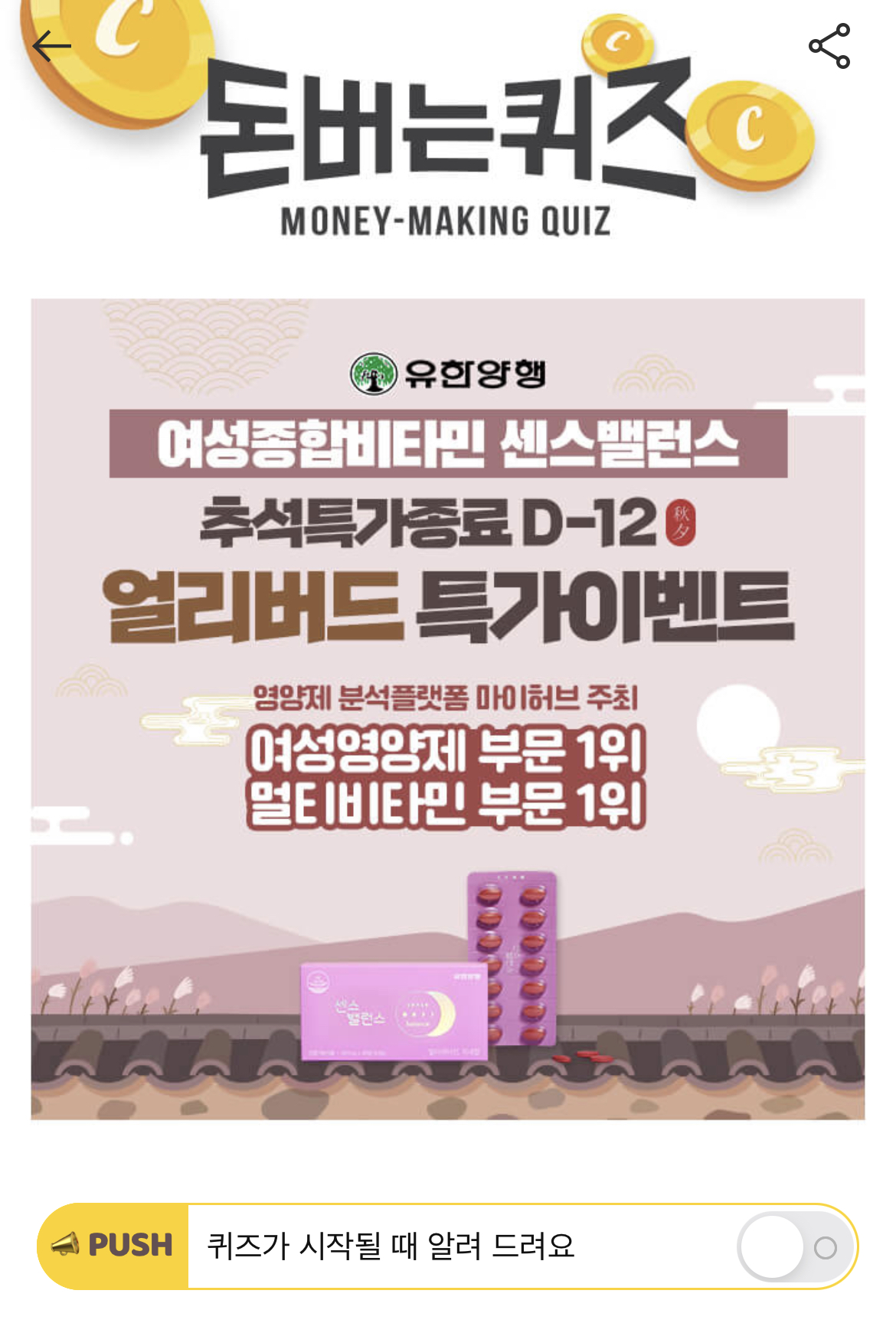 캐시워크 돈버는 퀴즈 정답 유한양행 여성종합비타민 센스밸스 알약크기