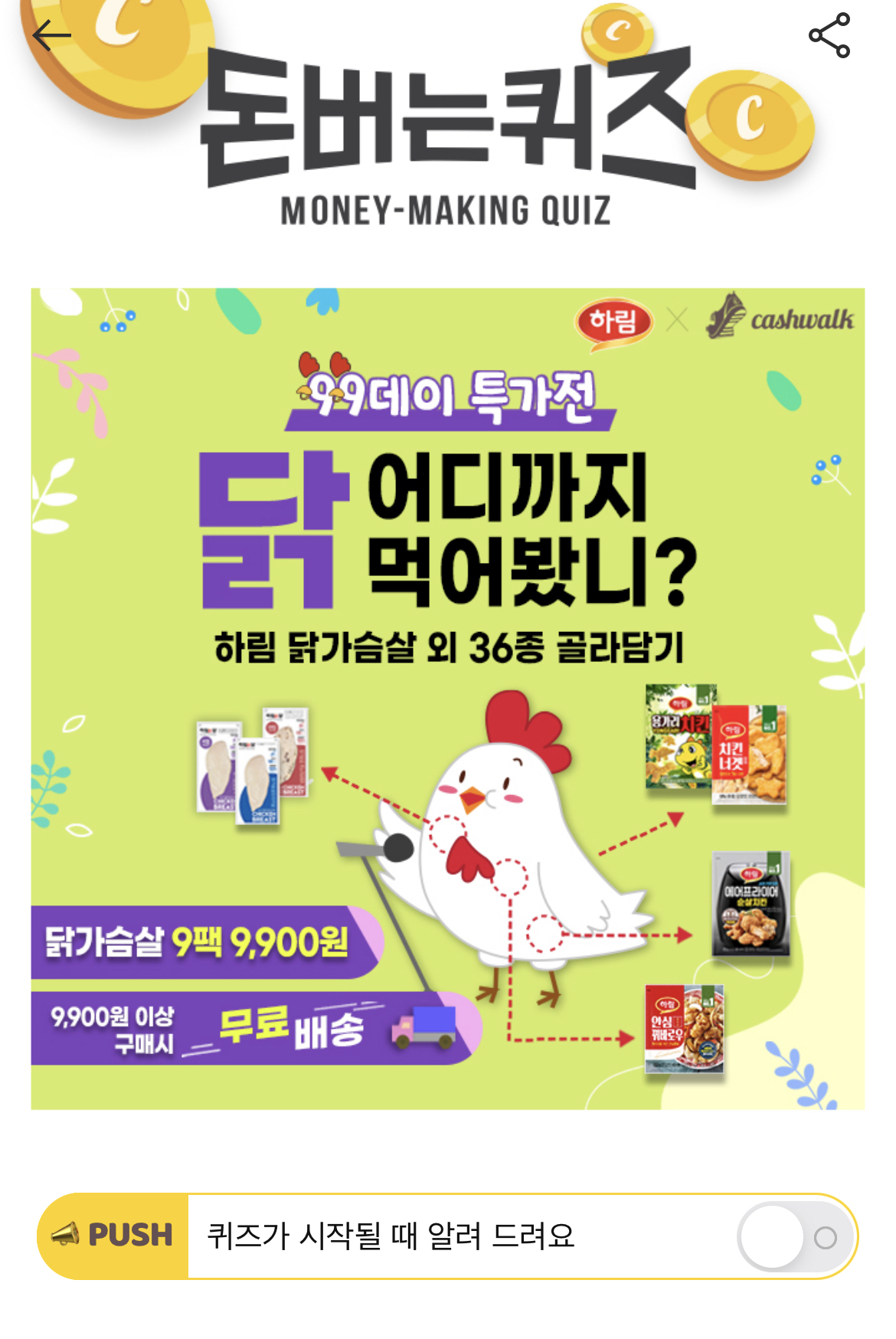 캐시워크 돈버는 퀴즈 정답 하림 99데이 특가전 ㅎㄹㄷㄱㅅㅅ