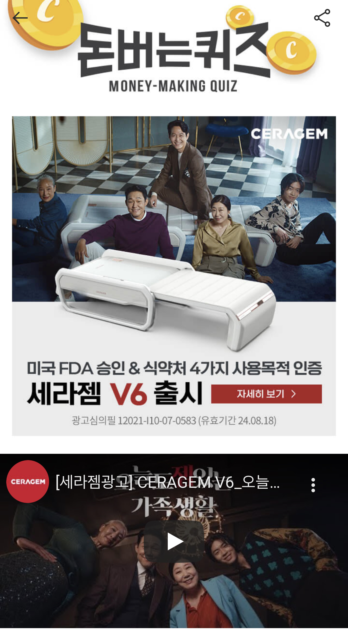 캐시워크 돈버는 퀴즈 정답 세라젬 V6 ㅎㅊㅈ