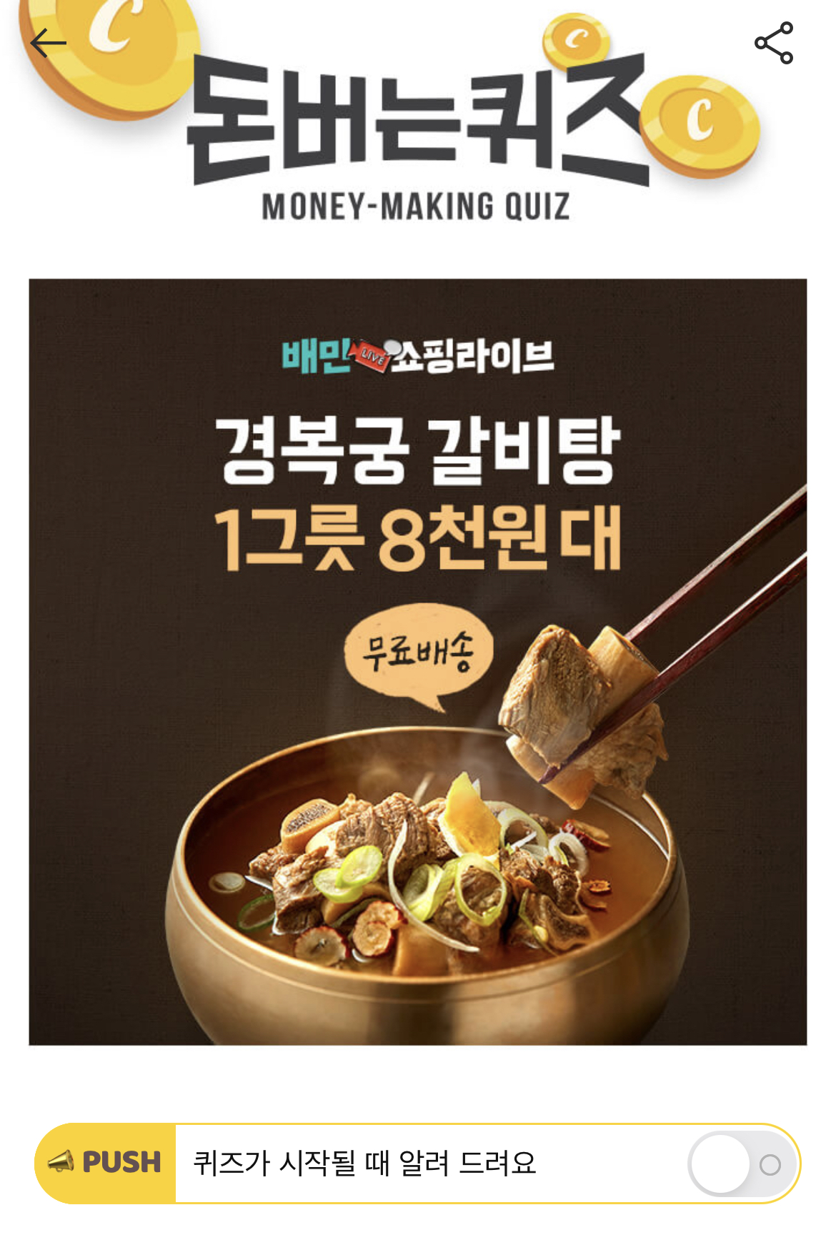 캐시워크 돈버는 퀴즈 정답 배민쇼핑라이브 경복궁 갈비탕