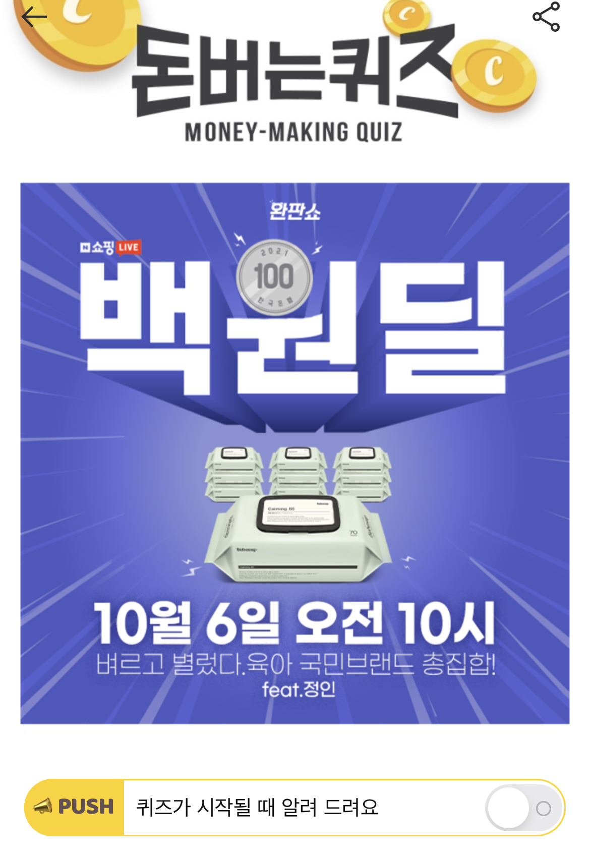 캐시워크 돈버는 퀴즈 정답 대한민국 대표 육아템 라이브 완판쇼 ㅁㅅㅊㅇ