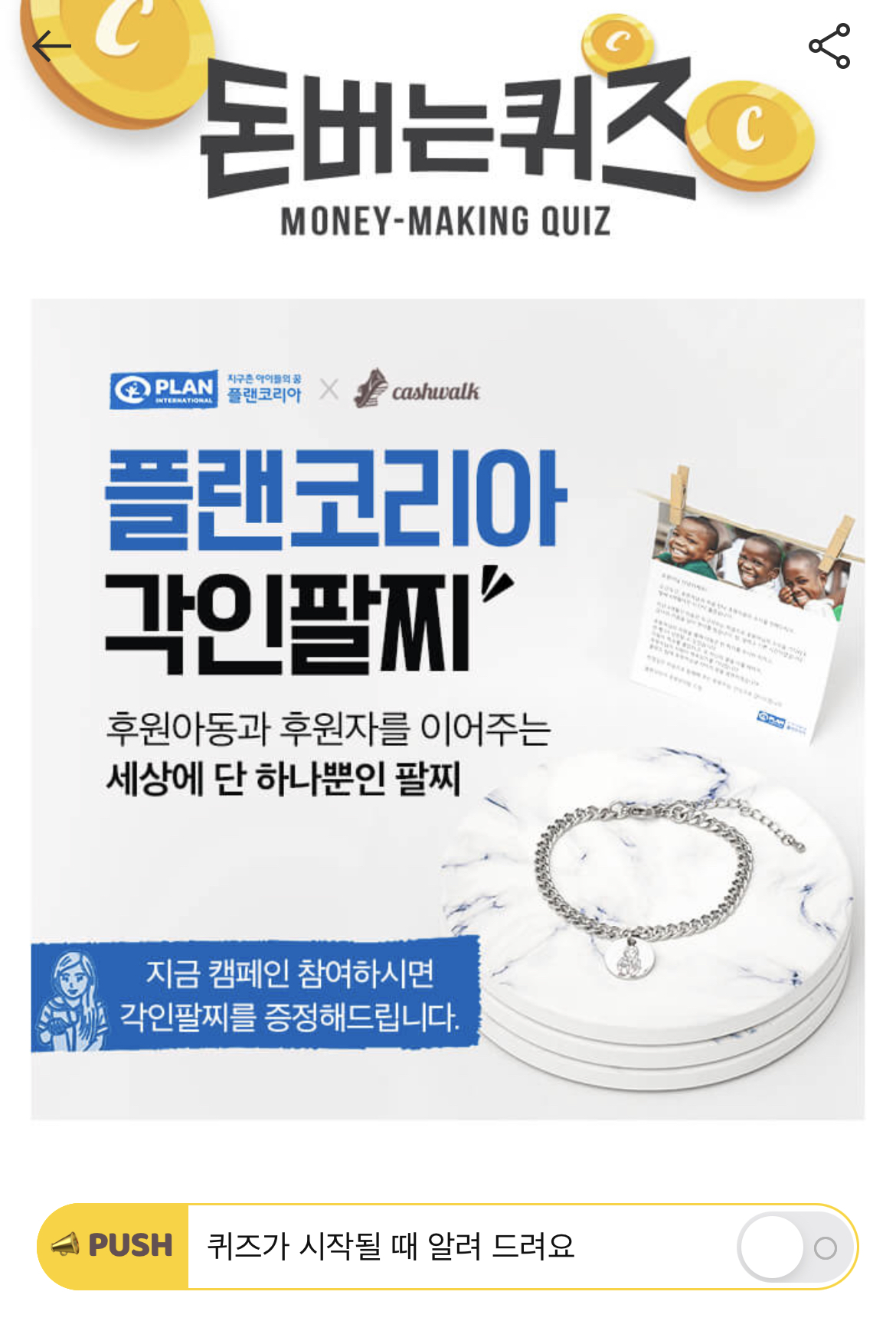 캐시워크 돈버는퀴즈 정답 플랜코리아 각인팔찌 ㅎㅇㅇㄷ