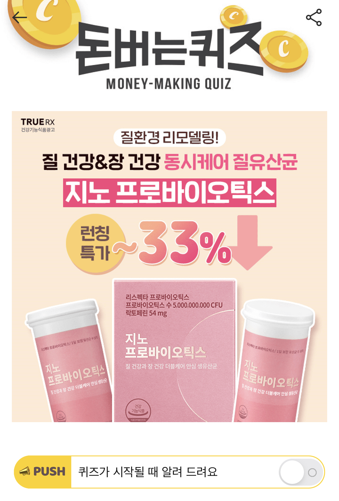 캐시워크 돈버는 퀴즈 정답 질유산균 지노 프로바이오틱스 유산균