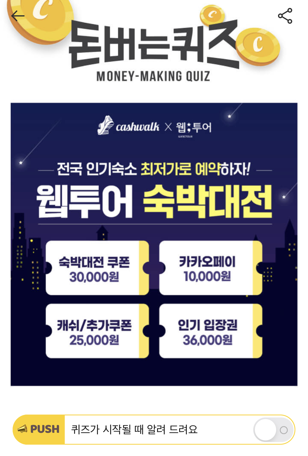 캐시워크 돈버는 퀴즈 정답 웹투어 대한민국 숙박대전 ㅅㅁㅇ