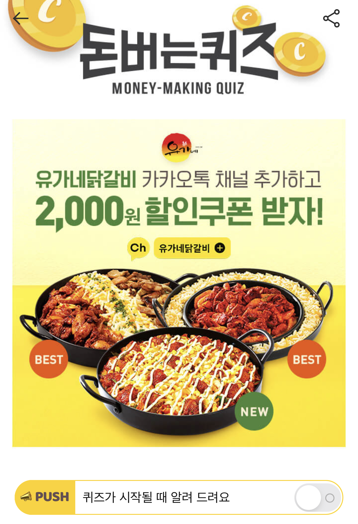 캐시워크 돈버는 퀴즈 정답 유가네닭갈비 신메뉴 콘치즈닭갈비 ㅅㅇㅌㅁㅇ
