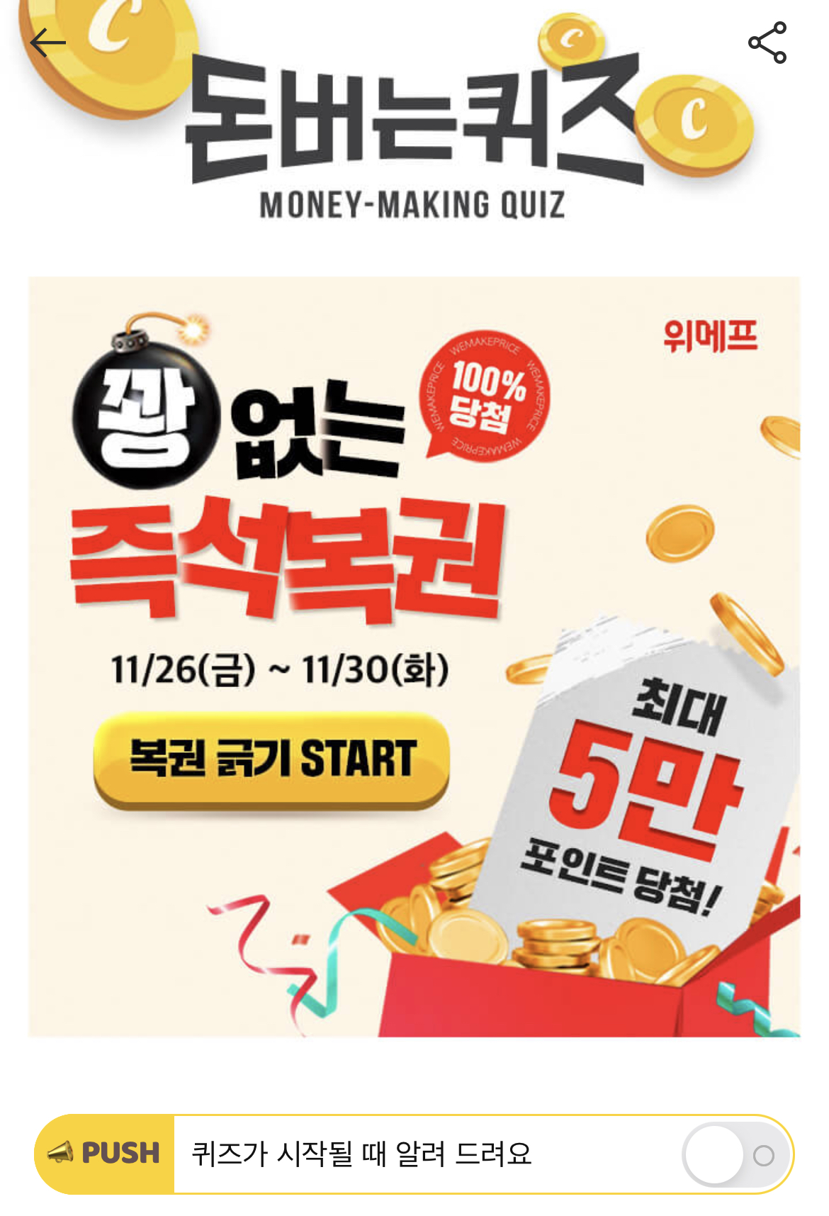 캐시워크 돈버는 퀴즈 정답 위메프 꽝없는 즉석복권 숫자