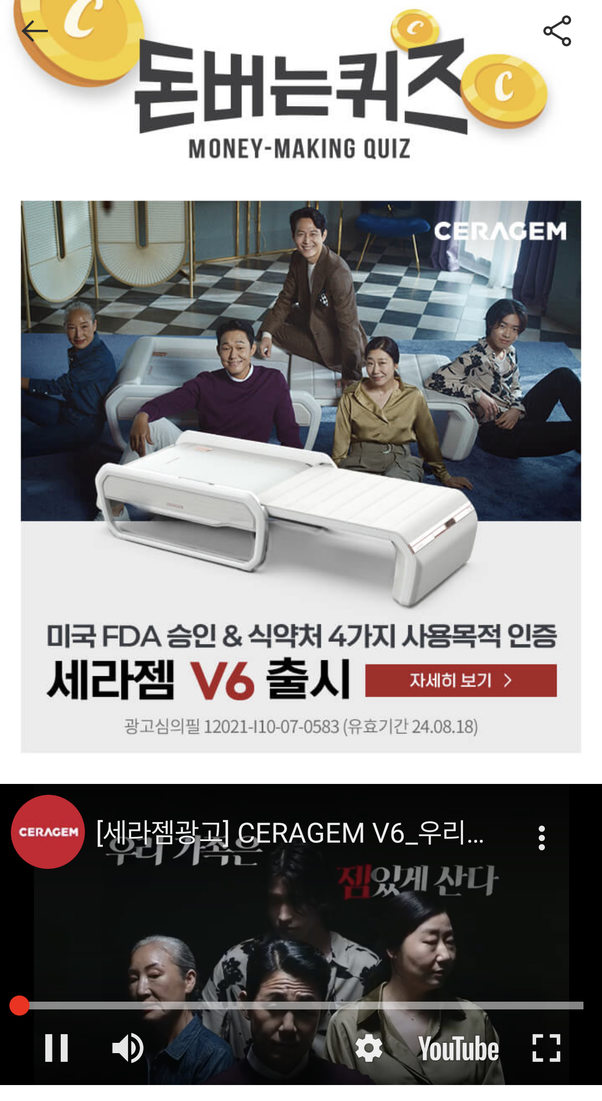 캐시워크 돈버는 퀴즈 정답 세라젬 V6 ㅊㄱㅍ