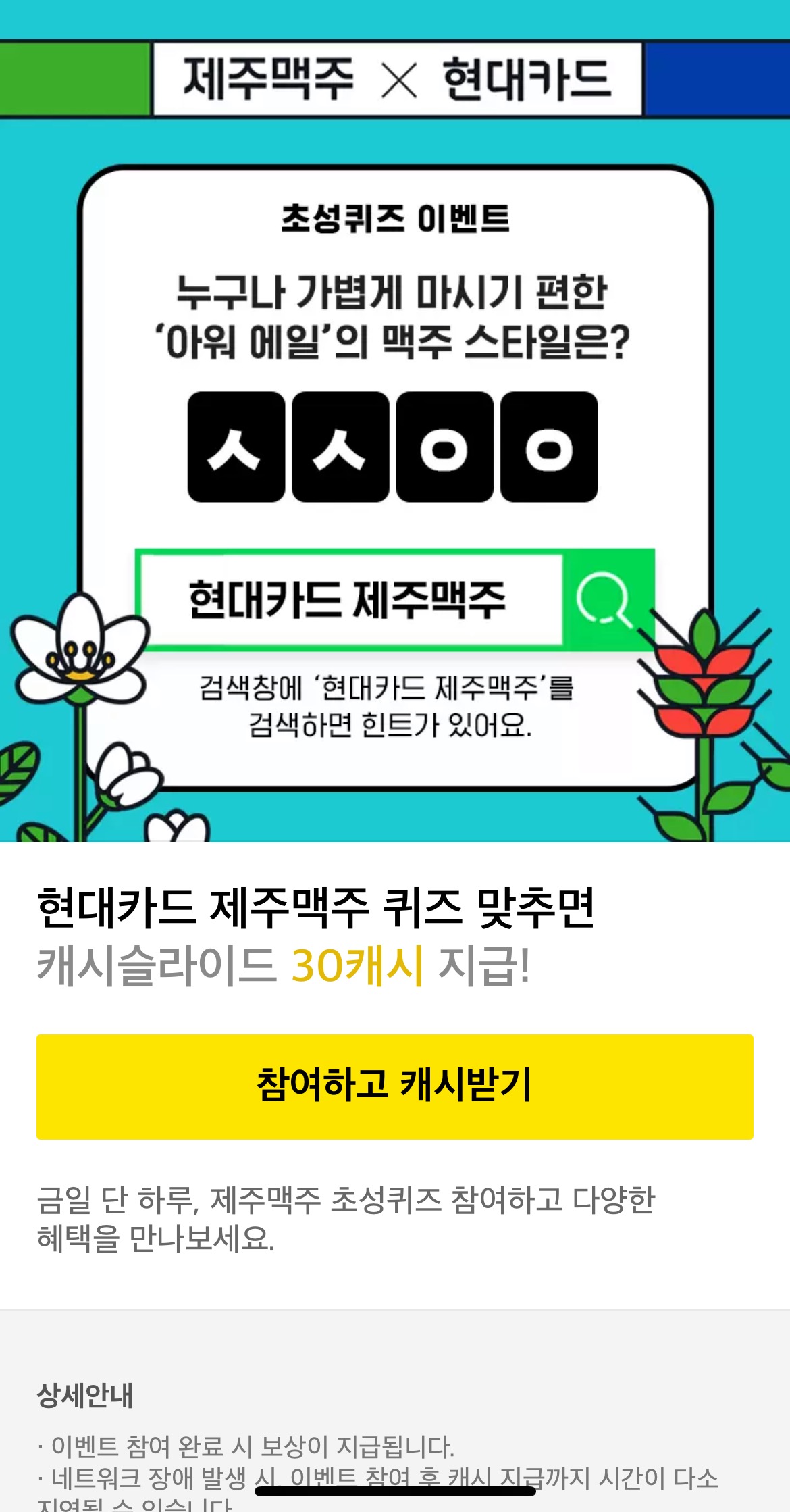 캐시슬라이드 초성퀴즈 이벤트 제주맥주 현대카드