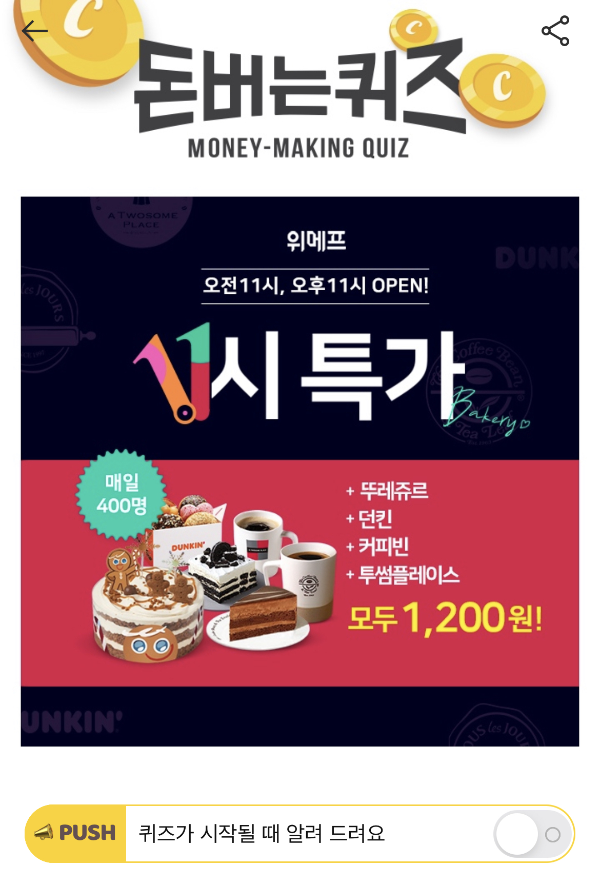 캐시워크 돈버는 퀴즈 정답 위메프 11시특가 ㅋㅋㄹ