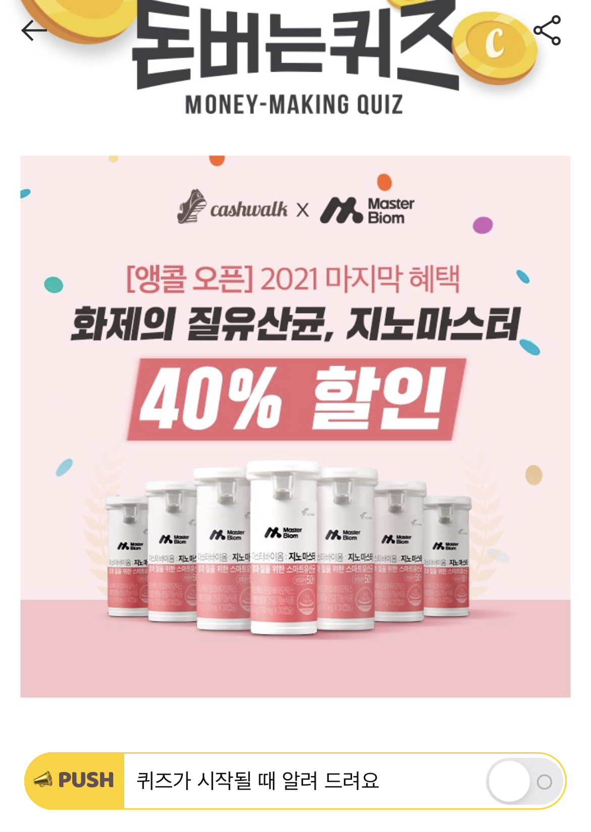 캐시워크 돈버는 퀴즈 정답 지노마스터 리스펙타 유산균 OO억 마리 숫자