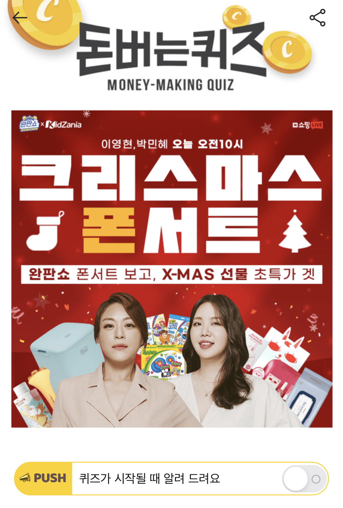 오늘 오전 10시, 장난감 초특가 구매 찬스! 이번 완판쇼 6화는 무려 OOOO에서 진행된대요! 이영현, 박민혜의 힐링보이스와 함께 크리스마스 폰서트를 즐겨봐요! 빈칸에 들어갈 단어는 무엇일까요? (힌트 : ㅋㅈㄴㅇ)