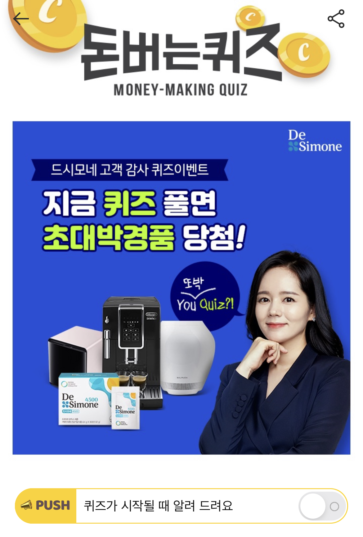 "드시모네 또박 퀴즈 온더 블럭 이벤트" 참여 시, 드롱기 커피머신, 비스포크 큐브 냉장고 등 6가지 초대박 경품 당첨은 물론 추첨을 통해 매회 100명에게 명품유산균 드시모네를 평생 OO% 할인받을 수 있는 평생할인권도 준비되어 있습니다. OO에 들어갈 숫자는 무엇일까요?