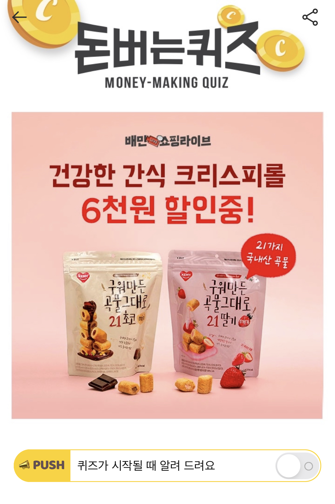 캐시워크 돈버는 퀴즈 정답 배민쇼핑라이브 크리스피롤 할인