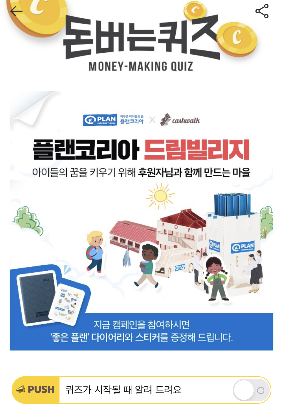 캐시워크 돈버는 퀴즈 정답 플랜코리아 드림빌리지 ㅅㅅㅌㅇ