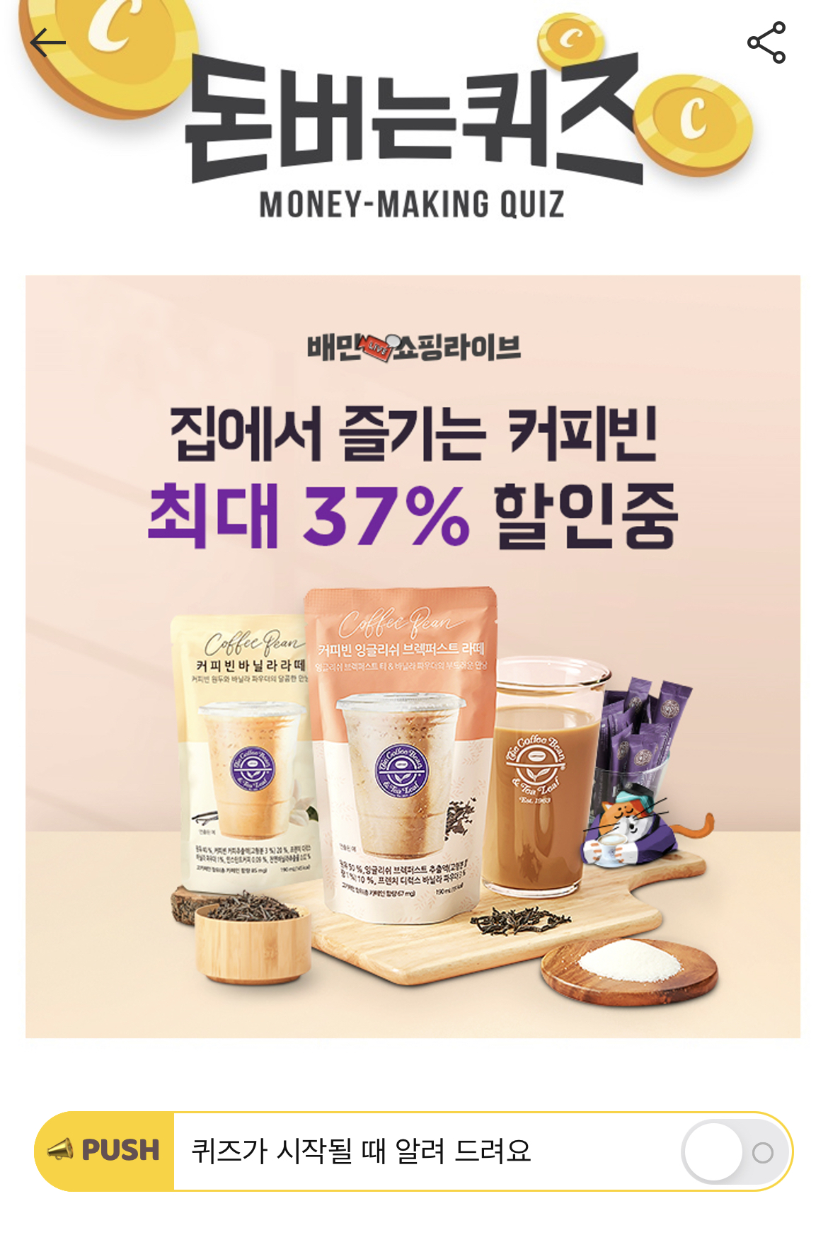 캐시워크 돈버는 퀴즈 정답 배민쇼핑라이브 커피빈 홈카페 숫자