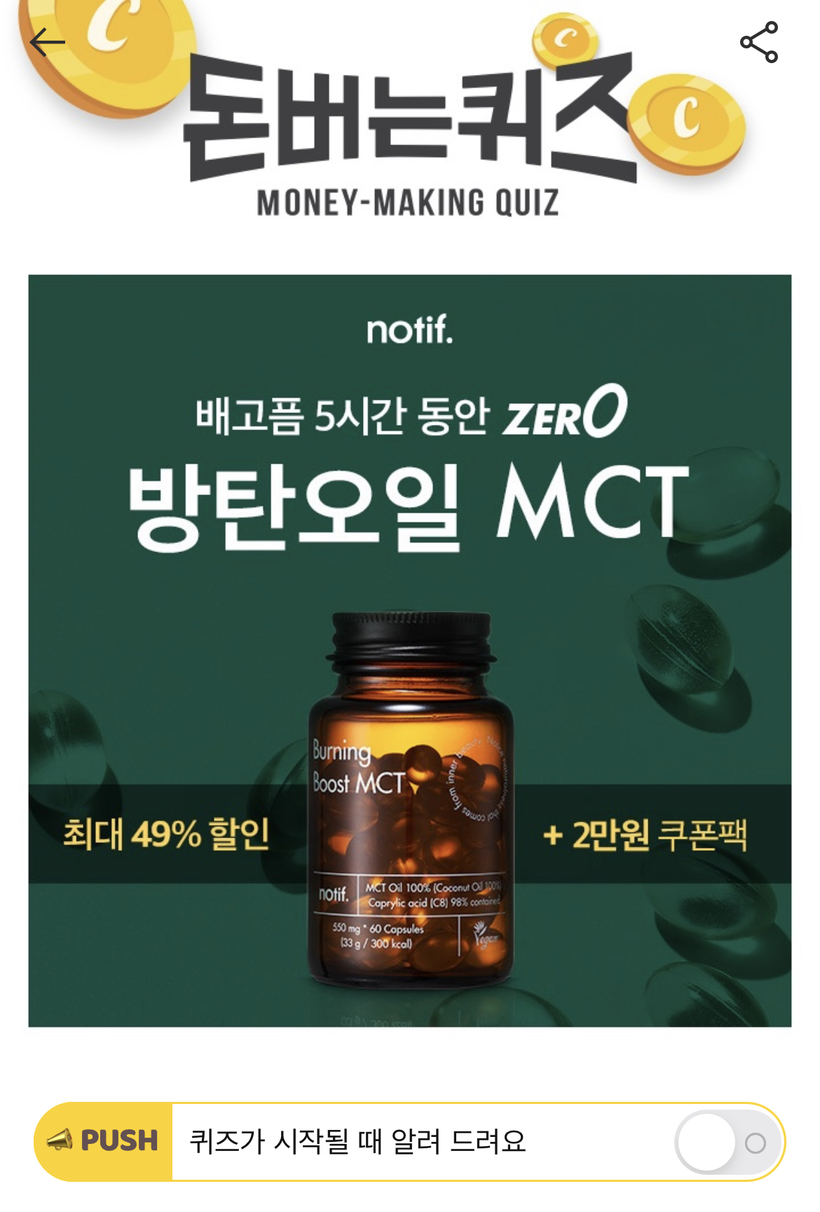캐시워크 돈버는 퀴즈 정답 노티프 방탄오일 MCT