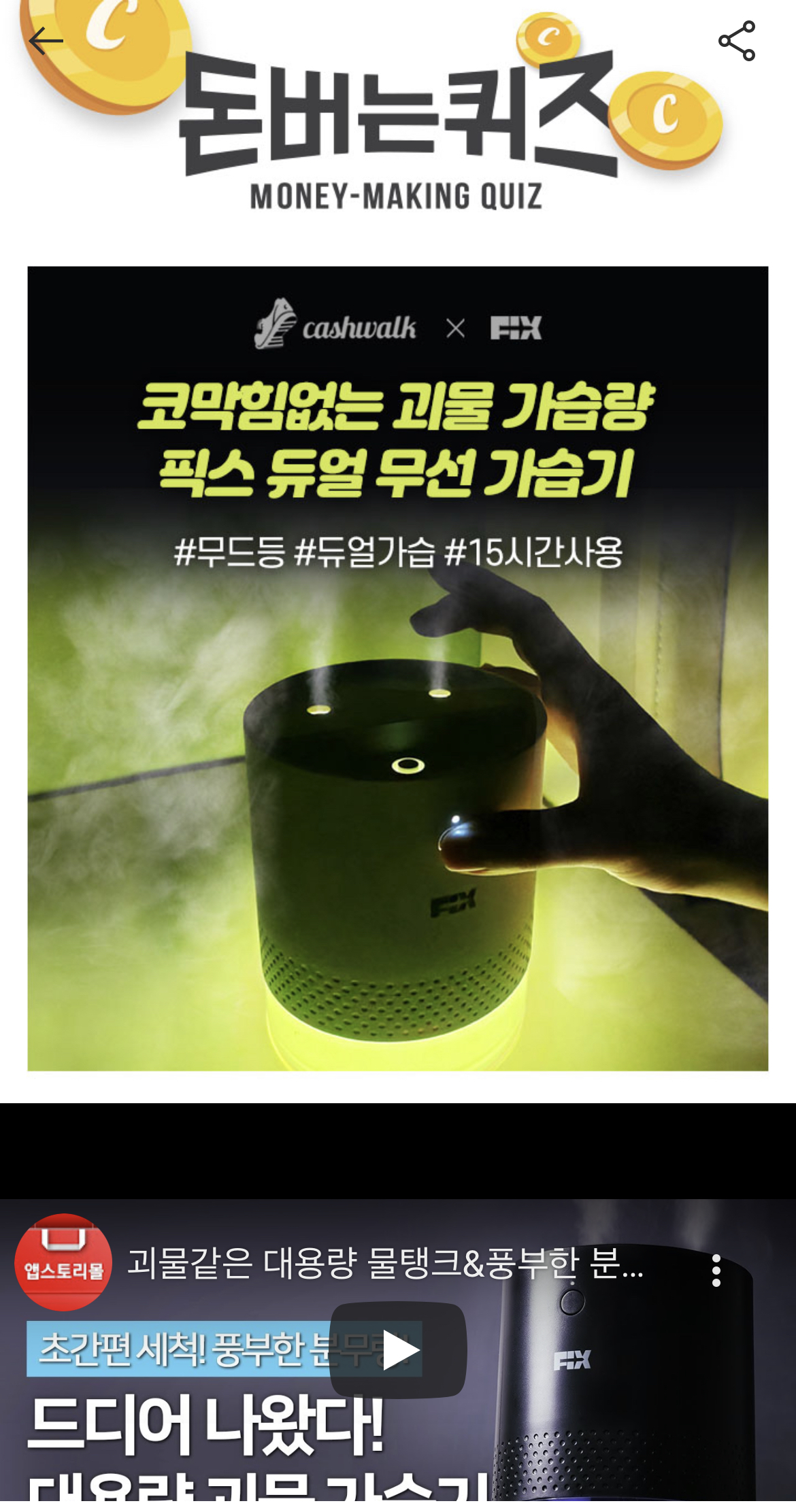 캐시워크 돈버는 퀴즈 정답 픽스 듀얼 무선 가습기 ㅁㅂㅊ