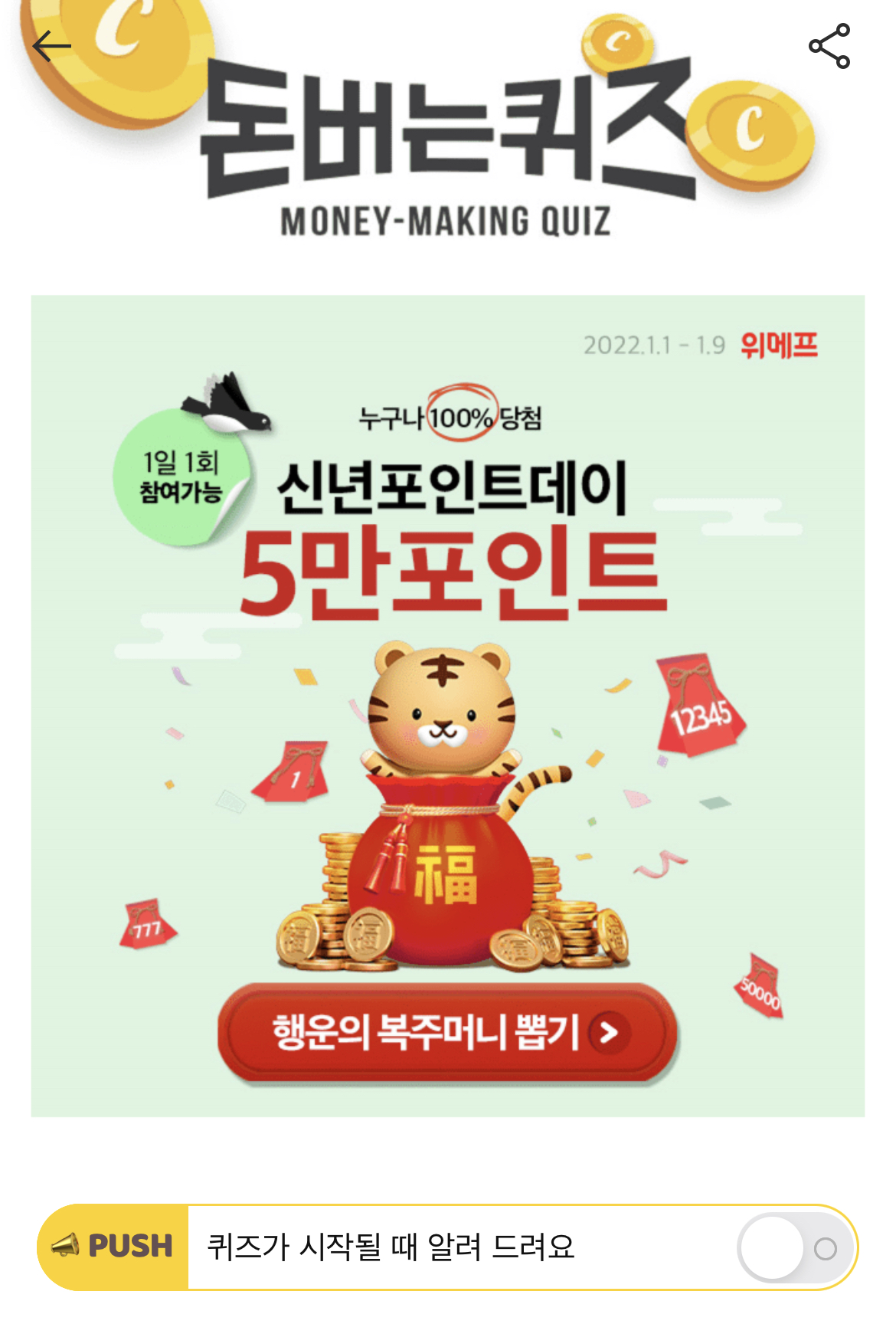 캐시워크 돈버는 퀴즈 정답 위메프 신년포인트데이 두번째 이벤트 OOO 1만원권