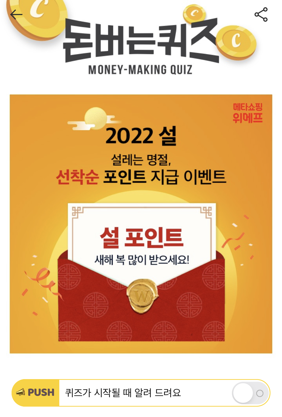 캐시워크 돈버는 퀴즈 정답 위메프 2022설 기획전 숫자