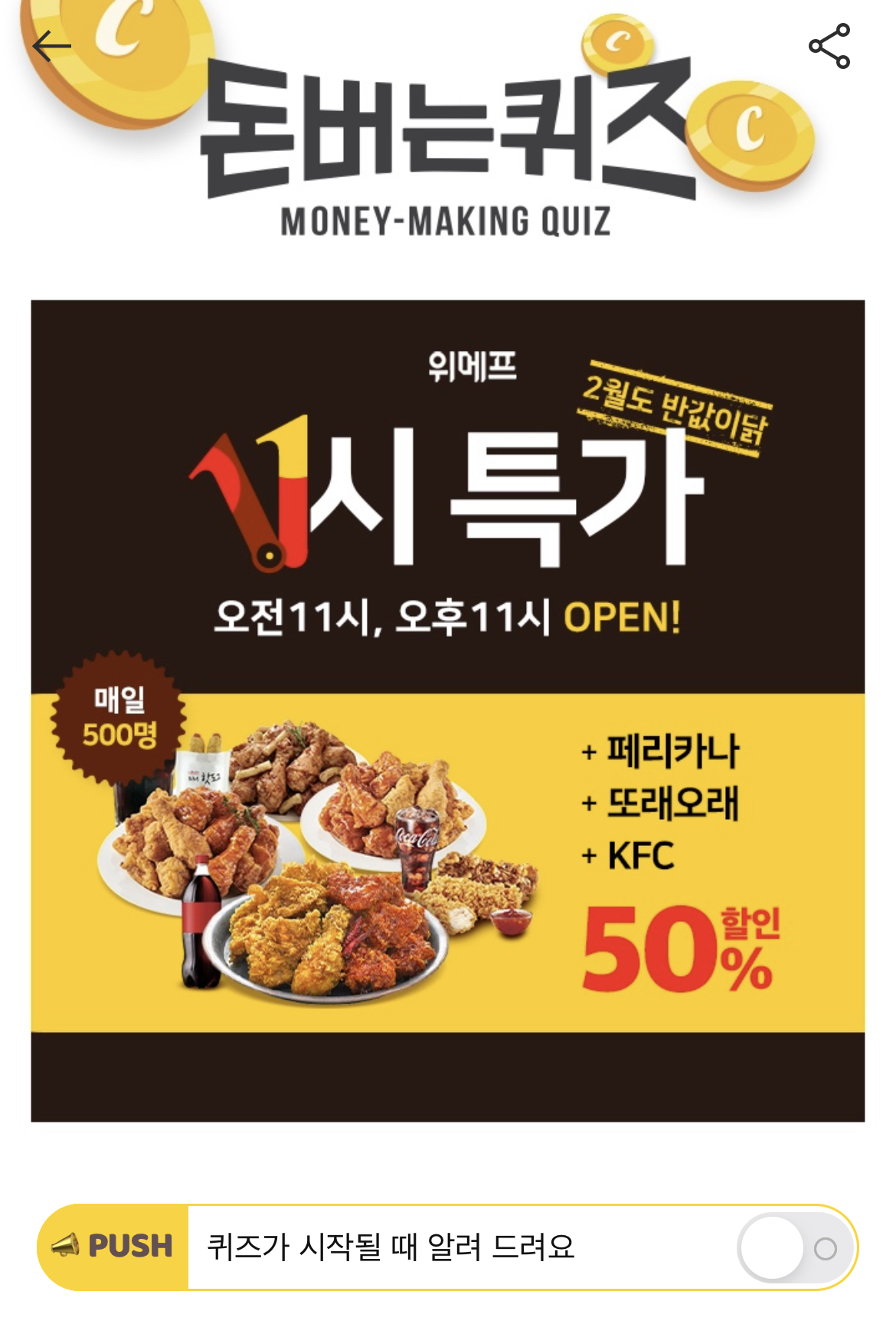 캐시워크 돈버는 퀴즈 정답 위메프 치킨 50% 한정수량 오픈 KFC OOO 블랙라벨세트세트 ㅆㄹㅇ