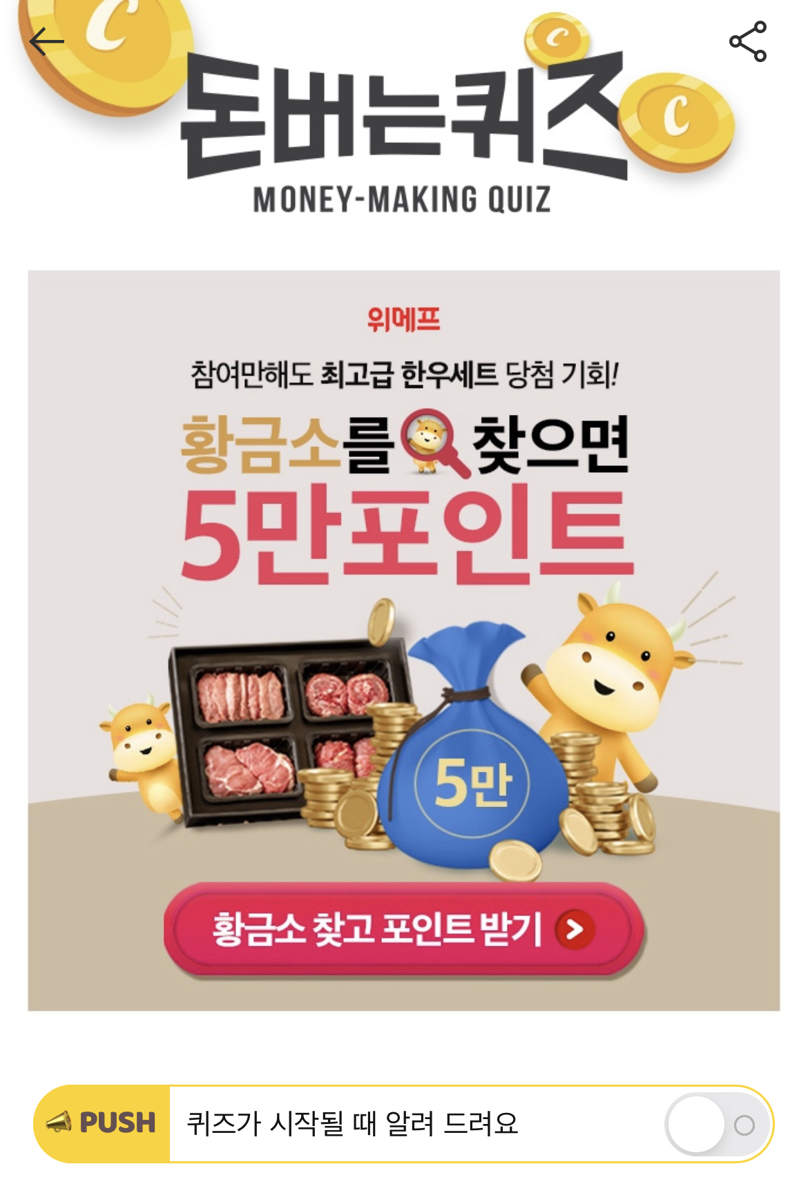 황금소를 찾아라! 이벤트는 매일 1만, 3만, 5만 참여자에게 최고급 OOOO를 보내드립니다! 빈칸에 들어갈 경품은 무엇일까요?