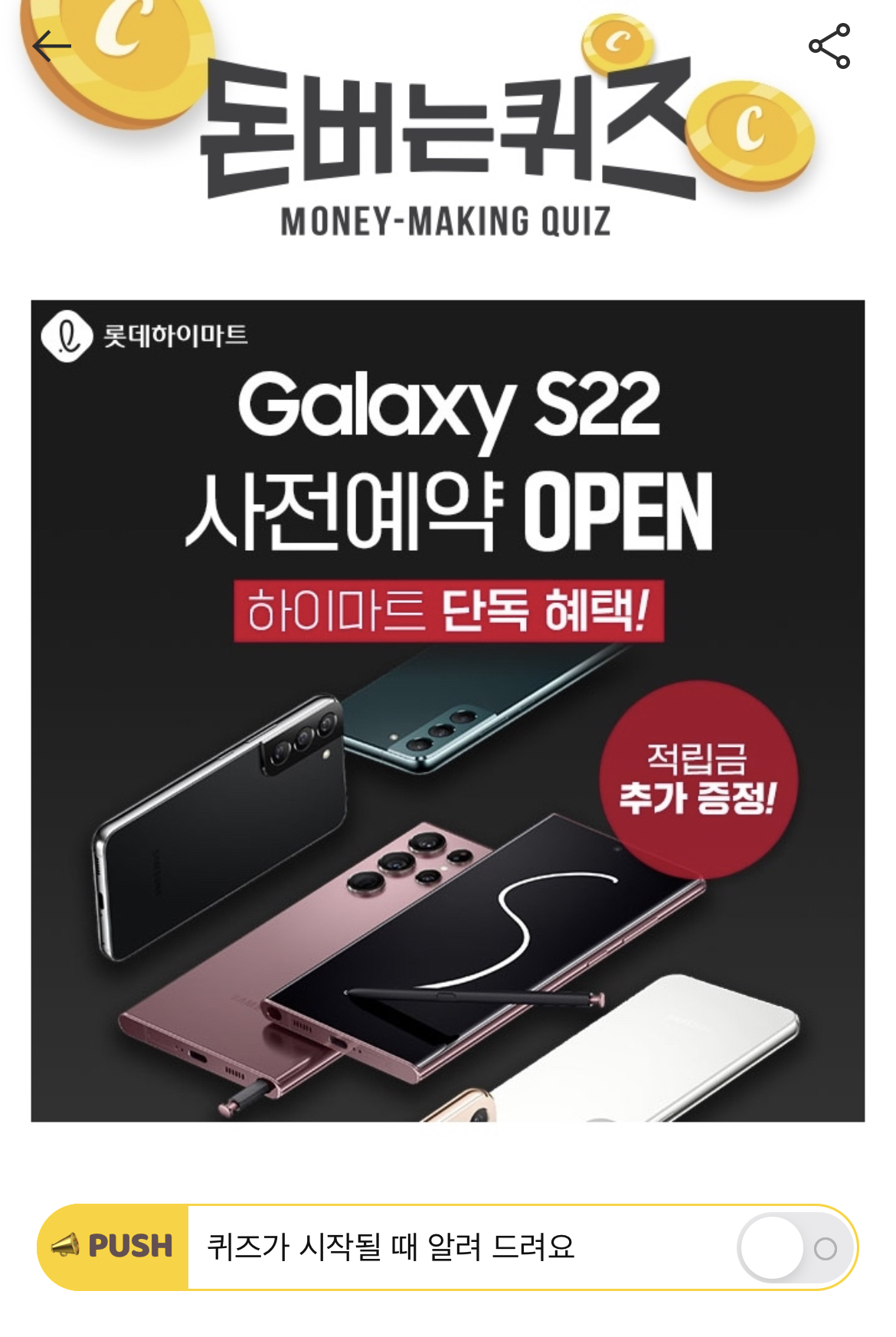 캐시워크 돈버는 퀴즈 정답 롯데하이마트 쇼핑몰 갤럭시S22 사전예약 숫자