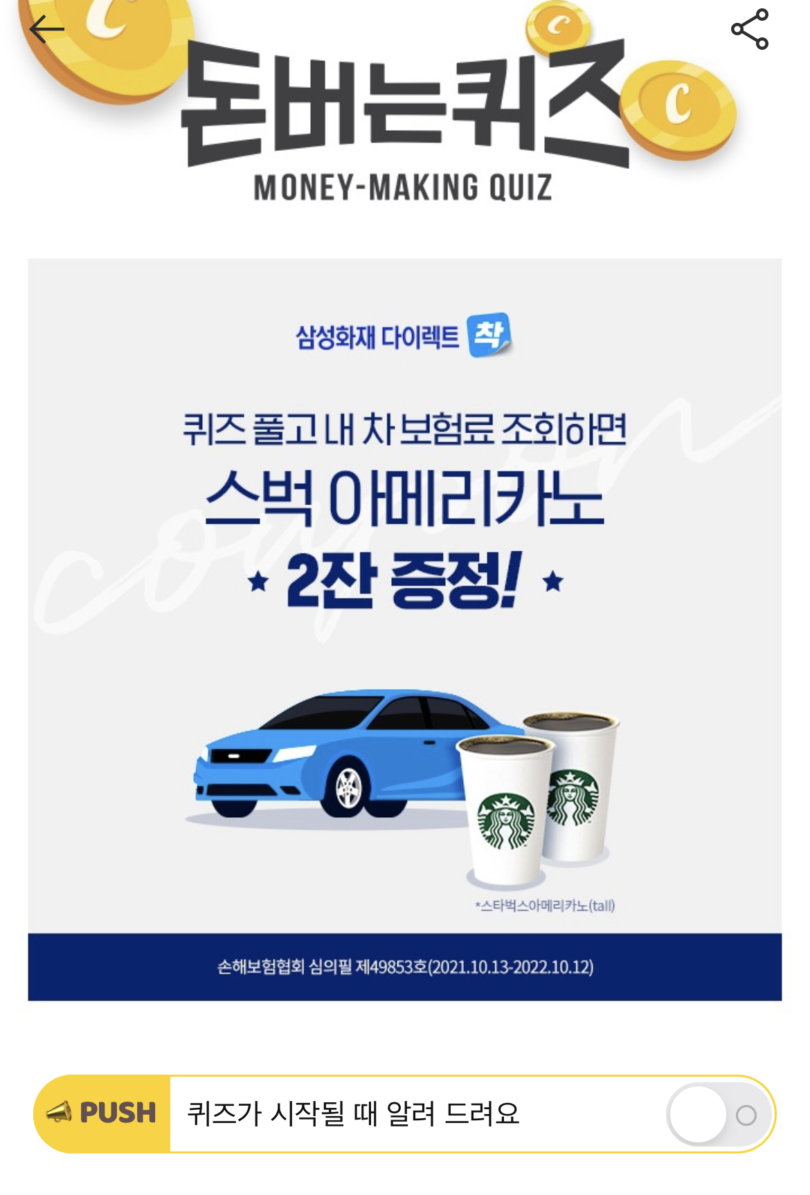 캐시워크 돈버는 퀴즈 정답 삼성화재 다이렉트 자동차보험 ㅈㅎ