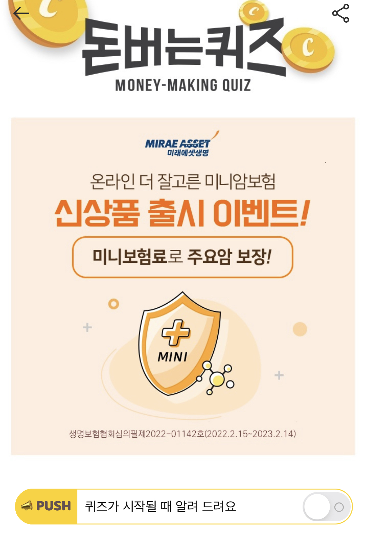 캐시워크 돈버는 퀴즈 정답 미래에셋생명 온라인 더 잘고른 미니암보험 숫자